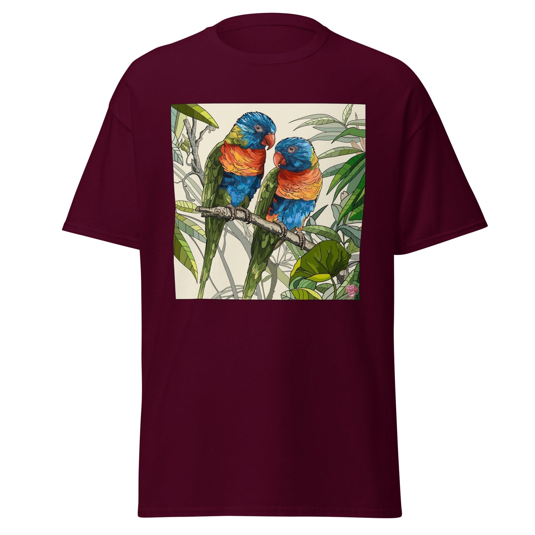 With pic two parrots on branch  and bright and cold